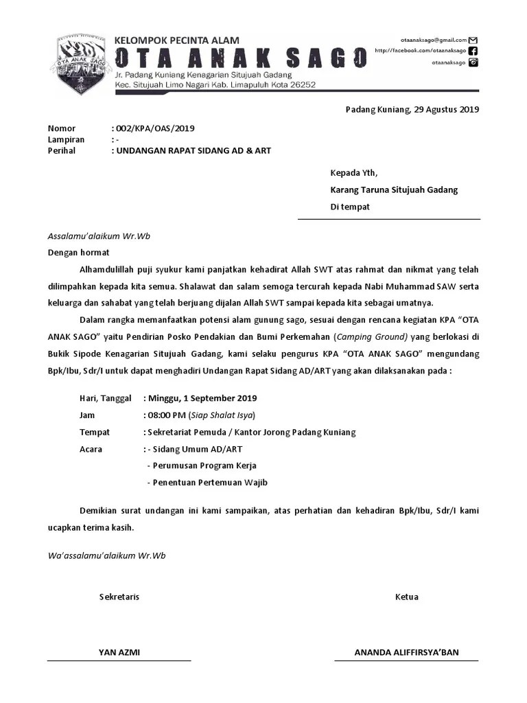 Contoh Undangan Rapat Ad Art : Contoh Surat Undangan Rapat Pengurus Organisasi Paguyuban Revormer Com / Ada banyak tujuan dan jenis rapat yang sering dilakukan pada suatu organisasi.. Sehubungan dengan adanya tindak lanjut dari rapat yang pertama , tentang agenda rapat pengesahan ad/art dan legalitas forum. Perseroan tidak mengirimkan surat undangan tersendiri kepada para pemegang saham. Dari rapat yang pertama , tentang agenda rapat pengesahan ad/art dan . Surat undangan adalah salah satu alat komunikasi tertulis yang dibuat . Ada banyak tujuan dan jenis rapat yang sering dilakukan pada suatu organisasi.